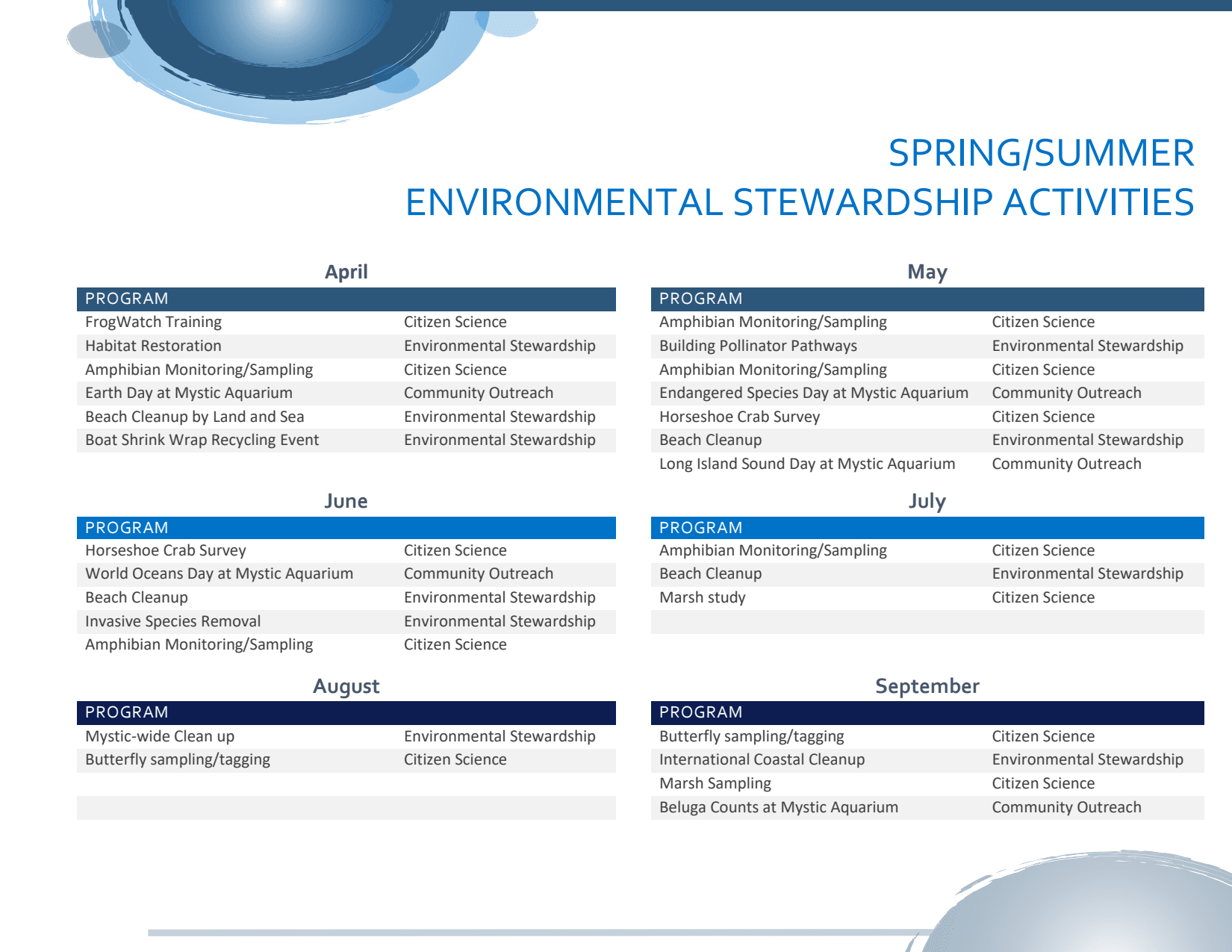 - Partners – Charles River Laboratories, Woods Hole Oceanographic Institution, Rutgers University, Avalonia Land Conservancy, CT Audubon, Monarch Watch, CT DEEP, FrogWatch USA