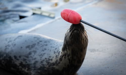 Gray seals by nature, are more nervous or cautious seals, and Echo is no different. She is timid around people, but she has been gaining confidence from the other harbor and spotted seals in the habitat. She is much more confident around the other animals and becomes more willing to participate in training behaviors. She follows their lead, trailing them as they travel from the indoor portion to the outdoor portion of the habitat. During training sessions, she will sometimes hop out of the water to be by the side of one of the other seals and participate in its training session! She enjoys sunken enrichment and likes to eat and play with ice. She is curious about gulls, who tend to visit during training sessions, hoping to snatch a fish or two. When Echo sees a gull, she’ll often just stop in the middle of her session to watch it.